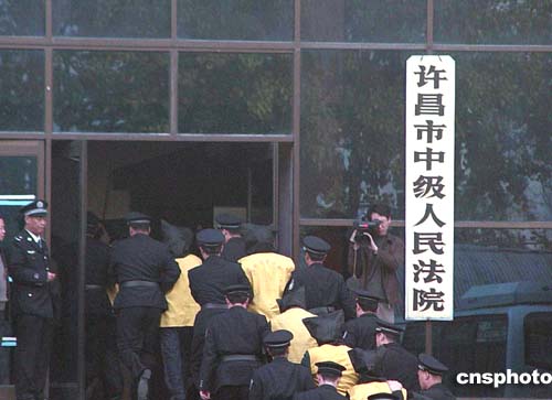被告人被押解進(jìn)入法庭。作者:史寶銀   法庭外聚集大批群眾。作者:史寶銀