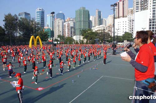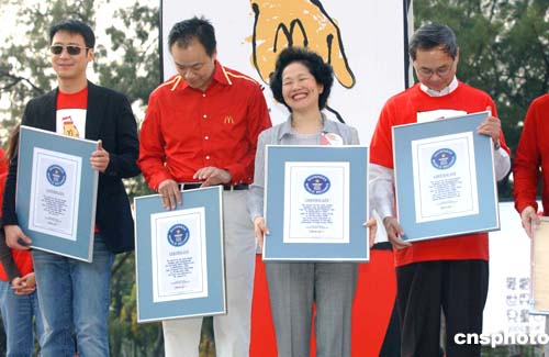 香港前政務司司長陳方安生、愛心大使黎明、麥當勞有限公司董事總經(jīng)理劉士盛等嘉賓,在香港維園出席“麥當勞世界兒童日2004”千人愛心跳繩,締造最多人跳繩的健力士世界紀錄。作者:洪少葵