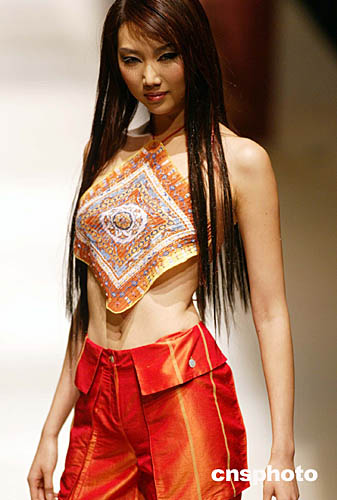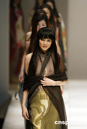 十一月二十四日,在中國國際時裝周北京飯店進行的著名時裝設計師梁子的天意二零零五春夏時裝發(fā)布會上,模特將設計師以水為主題、展現(xiàn)生命的和平、健康和魅力”的設計理念演繹得淋漓盡致。中新社記者:盛佳鵬