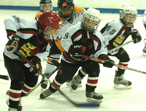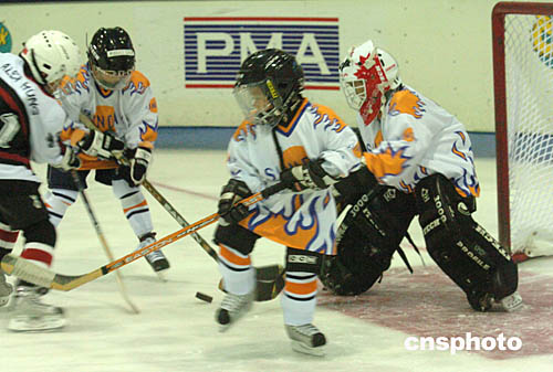 2004年亞太區(qū)少兒冰球賽25日在香港西九龍中心舉行﹐北京尚美虎仔隊(duì)(黑衣)以六比零戰(zhàn)勝香港隊(duì)。