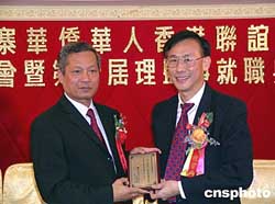 二十七日晚,柬埔寨華僑華人香港聯(lián)誼會在此間假借尖沙嘴海港城皇宮大酒店,舉辦成立慶典暨第一屆理監(jiān)事就職典禮。柬埔寨王國駐香港總領(lǐng)事館陳明光總領(lǐng)事(左)到會致賀辭,并接受首任會長鄭中贈送的紀念品。作者:關(guān)向東