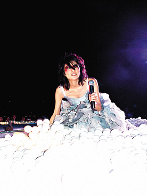 王菲的演唱會不會有變化多端的舞蹈或性感,但這晚她興之所至唱《精彩》時(shí),赤腳跑到臺前的“波波池”玩,更把白色波波拋給觀眾,自己又因?yàn)檎静环(wěn)兩度跌在池中,還開心地大笑,有如一個(gè)小朋友般頑皮。同時(shí)臺上又出現(xiàn)了漫畫版的王菲,這段漫畫是代替了之前一段讀白,因?yàn)槊看尾ネ暝撈味甲屓苏`會她打算退出,故主辦單位決定換掉。熒幕上出現(xiàn)的漫畫版王菲,肥肥白白,因?yàn)椤鞍⒎啤币幌蚨伎释约嚎梢耘忠稽c(diǎn)。演唱會以《人間》一曲結(jié)束,雖然歌迷熱情地大叫安哥,但向來沒有安哥習(xí)慣的她,以超過五分鐘的時(shí)間向觀眾深深鞠躬,代表了她對歌迷的謝意。