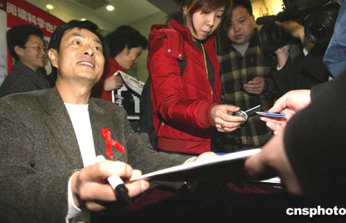 十二月一日是世界艾滋病日,著名電影演員、預(yù)防艾滋病形象大使濮存昕在北京王府井大街為市民簽名發(fā)放安全套。作者:史利