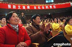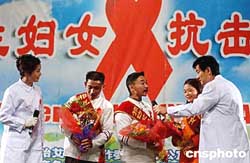 十二月一日,中國(guó)內(nèi)地演員濮存昕(右一)、蔣雯麗(左一)在“關(guān)注婦女,抗擊艾滋”活動(dòng)上,與來(lái)自四川資中公民鎮(zhèn)的艾滋病毒攜帶者同臺(tái)獻(xiàn)藝,該艾滋劇團(tuán)是由四川資中縣近二十名艾滋病感染者自發(fā)組建的。作者:韓藝冰