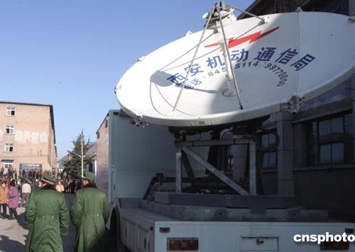 陜西銅川礦務(wù)局陳家山煤礦11月28日發(fā)生重大瓦斯爆炸事故后,中國各地媒體第一時間從四面八方蜂擁而至這個小山溝,各顯神通全方位報道事故的方方面面。圖為上海東方衛(wèi)視以每日兩萬元人民幣的租價,從西安租用的衛(wèi)星通訊車。作者:任晨鳴