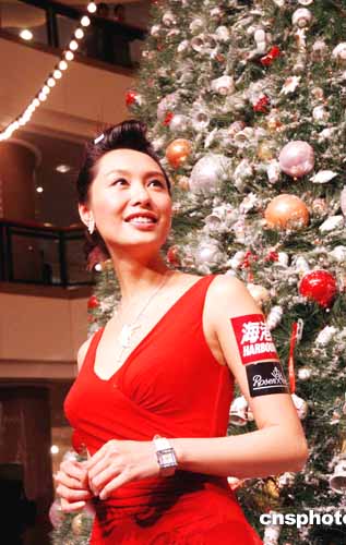 甚少露面的香港影視紅星朱茵一身紅衣打扮,出席海港城價值百萬的圣誕樹亮燈儀式。作者:洪少葵