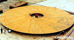 葛洲壩集團(tuán)機(jī)電建設(shè)有限公司職工正日夜奮戰(zhàn),為三峽工程提前一年竣工而努力。圖為12月6日三峽金屬結(jié)構(gòu)制造安裝工人正精心加工巨大的機(jī)組蓋板——“羅盤”。作者:孫榮剛