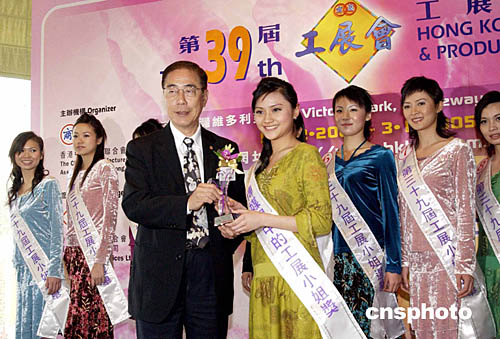 廠商聯(lián)合會會長楊孫西向率先出爐的“傳媒眼中的工展小姐”麥鍶銘頒獎(jiǎng)。