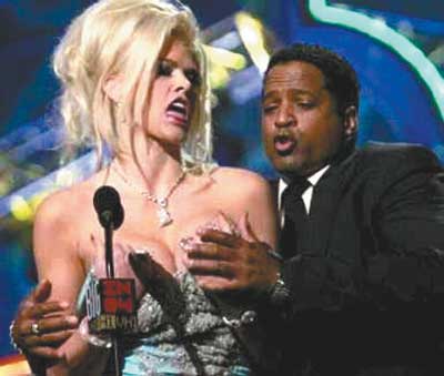 VH1音樂頻道2004頒獎晚會日前在洛杉磯舉行,安娜·尼科爾·史密斯也應(yīng)邀參加,不知為何,當(dāng)她走到舞臺上后,突然脫去了裙子,露出了自己的雙乳,及時趕到的保安用手盡量遮擋住她的乳房,強(qiáng)行將她拉到了后臺。據(jù)一位觀眾說:“當(dāng)時,史密斯看起來非常興奮,就在她脫裙子的一瞬間,一名保安把她拉到了后臺!笨墒牵搅撕笈_后史密斯仍然不老實,她甚至想讓攝影師給她拍裸照。前不久,史密斯在參加美國音樂頒獎晚會時,也因精神恍惚、吐字不清令觀眾無法聽懂她在說什么,還一度趴在臺上睡覺,結(jié)果主持人打斷了她的講話,將她請下舞臺。有消息說,她當(dāng)時要么是喝醉了,要么就是受到了吸毒的影響,但她的律師解釋說,由于這位名模的視力不太好,所以無法看清自動提詞機(jī)上的文字。