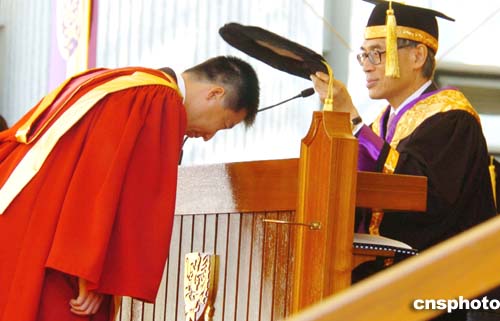 香港中文大學(xué)校長(zhǎng)劉遵義12月9日為中國(guó)首位登上太空的航天員楊利偉,頒授榮譽(yù)理學(xué)博士學(xué)位。作者:宋吉河