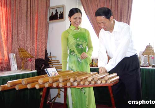 圣誕、新年前夕前往越南旅游的各地游客日益增多,越南的人文景觀及傳統(tǒng)文化吸引不少游客。圖為女藝人教導(dǎo)游客擊掌演奏排管樂(lè)曲。作者:周景洛