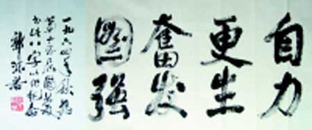 據(jù)了解,這幅寫(xiě)在1.42米×3.57米宣紙上的行書(shū)“自力更生奮發(fā)圖強(qiáng)”,八個(gè)字蒼勁有力、氣勢(shì)磅礴。一些人士分析,這恐怕是郭老書(shū)寫(xiě)的最大書(shū)法作品了。