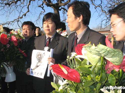 國(guó)際數(shù)學(xué)大師陳省身遺體告別儀式十二月十二日上午在天津北倉(cāng)殯儀館舉行。海內(nèi)外人士手捧大師遺像和他生前喜愛(ài)的紅掌花,依依送別陳省身先生。作者:柳俊武