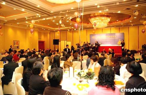 圖為中國(guó)新聞社總編輯郭招金[左]迎接中聯(lián)辦副主任王鳳超[中]蒞臨晚宴。作者:洪少葵