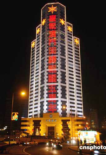 位于澳門繁華地段的中國銀行大廈,早早亮起了慶祝澳門回歸祖國五周年大型霓虹燈標(biāo)語,給這座不夜城增添了濃郁的節(jié)日喜慶氣氛。作者:宋吉河