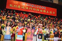來自小學(xué)舞蹈組的五十六位同學(xué),穿著五十六個少數(shù)民族的艷麗服裝,一一亮相,并表演了《歡聚澳門》歌舞劇。甫下飛機即趕來的潘曼霞不顧勞頓,高歌一曲《我愛你,中國》,贏得滿堂喝彩。