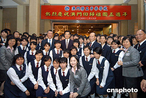 胡錦濤與夫人劉永清在澳門特首何厚鏵的陪同下參觀澳門勞工子弟學(xué)校,受到學(xué)校師生的熱烈歡迎。作者:梁永強(qiáng)