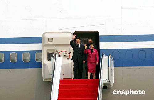 國家主席胡錦濤乘專機(jī)抵達(dá)澳門國際機(jī)場。圖為他向前往采訪的記者揮手致意。作者:董會峰