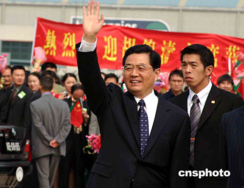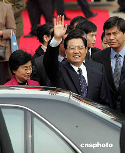 胡錦濤在何厚鏵的陪同下,向歡迎的當(dāng)?shù)孛癖姄]手致意。