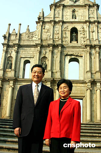 圖為胡錦濤和夫人劉永清在大三巴前合影。作者:董會(huì)峰