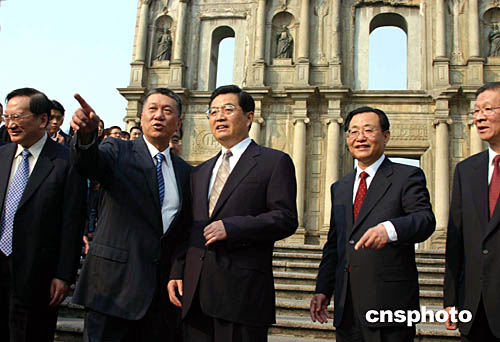 12月19日下午,胡錦濤主席興致勃勃參觀了澳門最具代表性的建筑——大三巴牌坊。