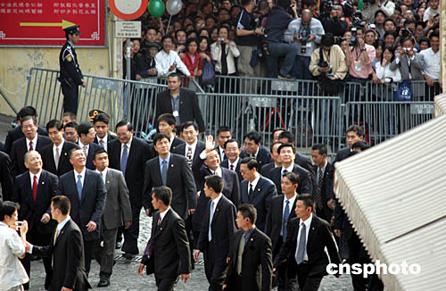 胡錦濤主席在參觀澳門大三巴時(shí)向當(dāng)?shù)孛癖姄]手致意。作者:宗金柱