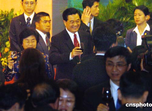中共中央總書記、國家主席、中央軍委主席胡錦濤,19日晚出席澳門特別行政區(qū)歡迎晚宴時(shí),向澳門參加晚宴的各界人士敬酒。作者:宋吉河