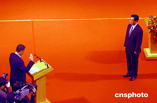新任特首何厚鏵宣誓就職,國家主席胡錦濤監(jiān)誓。作者:梁永強(qiáng)