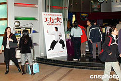 影星周星馳自編自導(dǎo)自演的《功夫》23日正式上映,香港開畫票房收411萬元,創(chuàng)下今年中西片最高開畫票房紀(jì)錄,而在內(nèi)地首日亦勁收1千萬元人民幣。圖為《功夫》宣傳海報放在戲院門前顯眼位置。作者:譚達明