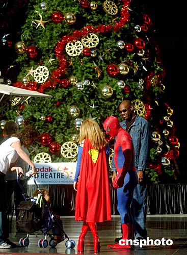 圣誕平安夜的美國洛杉磯好萊塢街頭,扮作電影明星“超人”和“蜘蛛俠”的藝術(shù)家與民眾共享圣誕快樂。中新社記者:賈國榮