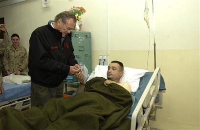 中新網(wǎng)12月26日電 美國國防部長拉姆斯菲爾德在圣誕前夕突然造訪伊拉克的美軍部隊,并且慰問軍中的傷員。