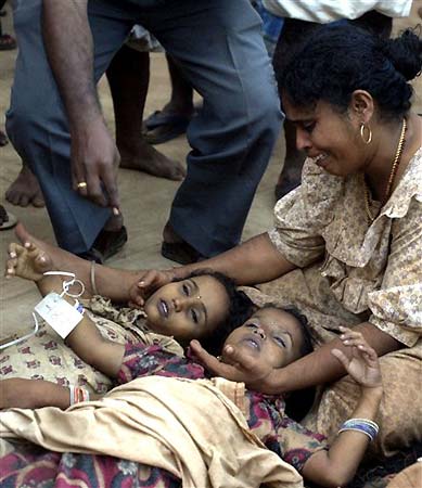 圖為印度海岸一座小鎮(zhèn)上,一位母親悲痛欲絕的坐在海嘯中死去的兩個(gè)女兒身邊。(固山)