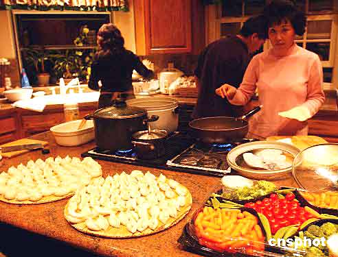 美國洛杉磯的一個華人家庭在圣誕節(jié)之夜舉辦家庭沙龍,親朋好友在廚房包中國餃子,在這個西式節(jié)日里享受中國傳統(tǒng)美食。賈國榮 2004-12-26 12:43:25