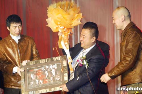 | 十二月三十日,中國知名家具企業(yè)——曲美家具公司在北京順義的“曲美工業(yè)園”舉行曲美二零零五經銷商年會暨新產品發(fā)布會,歷屆金雞、百花獎最佳男演員得主、北京曲美家具形象代言人葛優(yōu)(右),與中國著名導演馮小剛(左)親臨現場,向北京曲美家具公司總裁趙瑞海先生(中)贈送《天下無賊》經典劇照以表示祝賀。作者:盛佳鵬