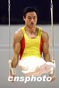 5月14日晚,中國國家體操隊隊員楊威在江蘇蘇州舉行的全國體操錦標賽暨雅典奧運選拔賽資格賽吊環(huán)比賽中大顯身手,并以總分57.825分的成績獲得全能冠軍。中新社記者:盛佳鵬