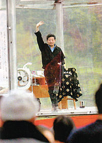 5月7日下午3時35分,絕食49天的陳建民在醫(yī)務(wù)人員攙扶下走出玻璃房進入升降機。他的體重由49天前的69公斤降到了現(xiàn)在的49公斤。