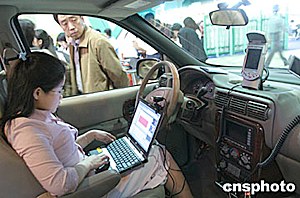 五月中旬,在北京科技周展覽會(huì)上,一種可在移動(dòng)的汽車上完成全套辦公業(yè)務(wù)的“車載辦公室”向觀眾亮相!败囕d辦公室”有無線網(wǎng)絡(luò)、衛(wèi)星導(dǎo)航、傳真打印等各種配置。中新社記者:史利