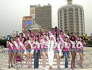 參加由澳門博彩股份有限公司承辦的“世界名模在澳門”活動(dòng)的第十六屆世界模特小姐大賽三十國冠軍佳麗十七日首次匯聚濠江,在澳門著名的葡京酒店前廣場(chǎng)合影,展示風(fēng)采。中新社記者:李剛