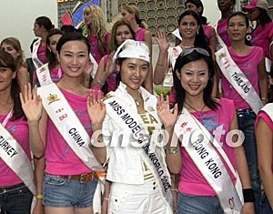 參加由澳門博彩股份有限公司承辦的“世界名模在澳門”活動(dòng)的第十六屆世界模特小姐大賽三十國冠軍佳麗十七日首次匯聚濠江,在澳門著名的葡京酒店前廣場(chǎng)展示風(fēng)采,圖為中國區(qū)冠軍馬力(左)、上屆世界冠軍延魏(中)和香港冠軍張穎向澳門致意。中新社記者:李剛