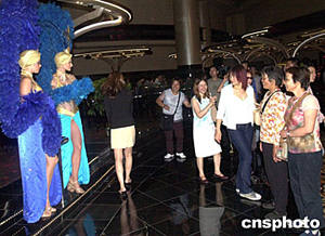 首間來自美國(guó)拉斯韋加斯大型娛樂場(chǎng)酒店“金沙娛樂場(chǎng)”十八日在澳門開幕,來自美國(guó)拉斯韋加斯的艷舞女郎在現(xiàn)場(chǎng)迎接客人,使澳門市民及游客大開眼界。中新社記者:李剛