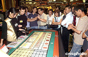 首間來自美國(guó)拉斯韋加斯大型娛樂場(chǎng)酒店“金沙娛樂場(chǎng)”十八日在澳門開幕,等候多時(shí)的澳門市民及游客終于進(jìn)入娛樂場(chǎng)內(nèi),但多為觀看者,真正下注者并不多見。中新社記者:李剛