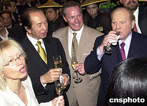 首間來自美國(guó)拉斯韋加斯大型娛樂場(chǎng)酒店“金沙娛樂場(chǎng)”十八日在澳門開幕,澳門“賭王”何鴻燊親自到場(chǎng)向金沙高層人士表示祝賀。中新社記者:李剛