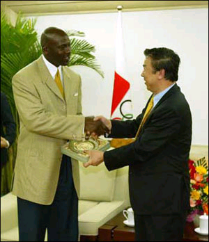 喬丹首先對(duì)中國(guó)奧委會(huì)和袁偉民主席的接見(jiàn)表示感謝,他說(shuō):“這是我第一次來(lái)中國(guó),我期待著見(jiàn)到更多的球迷。我在NBA打球時(shí),曾經(jīng)與中國(guó)球星姚明等同場(chǎng)競(jìng)技,感覺(jué)非常愉快。本次中國(guó)之行的主要目的就是與中國(guó)青年接觸,通過(guò)籃球教育青年,推廣籃球!