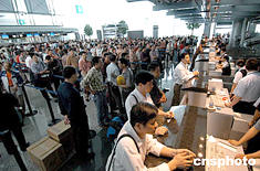 廣州新白云機(jī)場(chǎng)五月二十日進(jìn)行了第一次試運(yùn)營(yíng)演練,以檢驗(yàn)新機(jī)場(chǎng)各項(xiàng)功能的運(yùn)行,本次演練中二千五百名模擬旅客分別進(jìn)行了二十五個(gè)國(guó)內(nèi)、國(guó)際航班的登機(jī)演練。圖為“旅客”們?cè)谵k理登機(jī)手續(xù)。作者:羅仰明