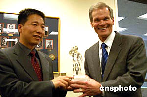 當(dāng)?shù)貢r(shí)間五月二十日下午,中國(guó)首位進(jìn)入太空飛行的航天員楊利偉在華盛頓會(huì)晤美國(guó)上世紀(jì)八十年代的航天員、現(xiàn)在的國(guó)會(huì)參議員比爾·納爾遜。這是楊利偉向納爾遜贈(zèng)送中國(guó)航天員水晶模型。中新社記者:余東暉