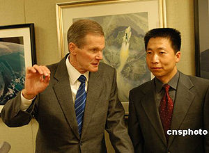 當(dāng)?shù)貢r(shí)間五月二十日下午,中國(guó)首飛航天員楊利偉在華盛頓拜會(huì)美國(guó)上世紀(jì)八十年代的航天員、現(xiàn)任國(guó)會(huì)參議員比爾·納爾遜,兩人展開(kāi)了真誠(chéng)而幽默的對(duì)話。中新社記者:余東暉