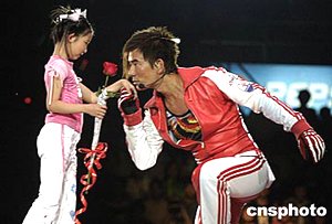 “齊長大”任賢齊北京演唱會(huì)五月二十二日晚在首都體育館舉行,演唱會(huì)的高潮出現(xiàn)在“香車美女”環(huán)節(jié),任賢齊為一名5歲的小美女單膝跪地送上玫瑰并騎上摩托帶她環(huán)場(chǎng)一周。中新社記者:高遠(yuǎn)