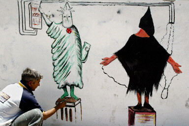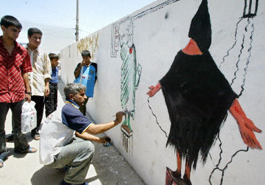 5月23日,一名伊拉克藝術(shù)家在巴格達(dá)附近的薩德爾城將美軍虐待伊拉克俘虜?shù)恼掌嫷綁Ρ谏希⒃谂赃叜嬌弦粋(gè)美國“自由女神像”。