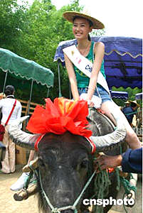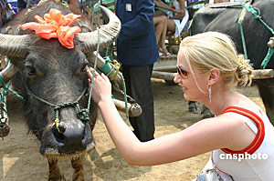 參加第十六屆世界模特小姐大賽國際總決賽的各國佳麗五月二十四日來到杭州江南第一漂,首次見到大水牛的佳麗們禁不住與水牛親密接觸。作者:張茵