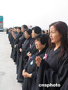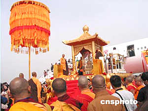 在儀式上,一誠(chéng)法師、覺(jué)光法師、學(xué)誠(chéng)法師分別拈香,誦經(jīng)、跪拜。來(lái)自西安大慈恩寺六十多名僧侶儀仗隊(duì)高奏佛樂(lè),數(shù)百名佛家居士齊聲念佛。